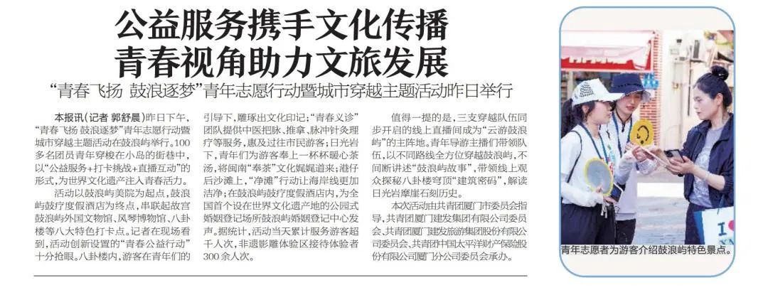 6月21日,由共青團(tuán)廈門市委員會(huì)指導(dǎo),共青團(tuán)廈門建發(fā)集團(tuán)有限公司委員會(huì)、共青團(tuán)廈門建發(fā)旅游集團(tuán)股份有限公司委員會(huì)、共青團(tuán)中國(guó)太平洋財(cái)產(chǎn)保險(xiǎn)股份有限公司廈門分公司委員會(huì)承辦的“青春飛揚(yáng) 鼓浪逐夢(mèng)”青年志愿行動(dòng)暨城市穿越主題活動(dòng)圓滿舉行。《廈門晚報(bào)》以《公益服務(wù)攜手文化傳播 青春視角助力文旅發(fā)展》為題進(jìn)行了相關(guān)報(bào)道,特摘錄分享。