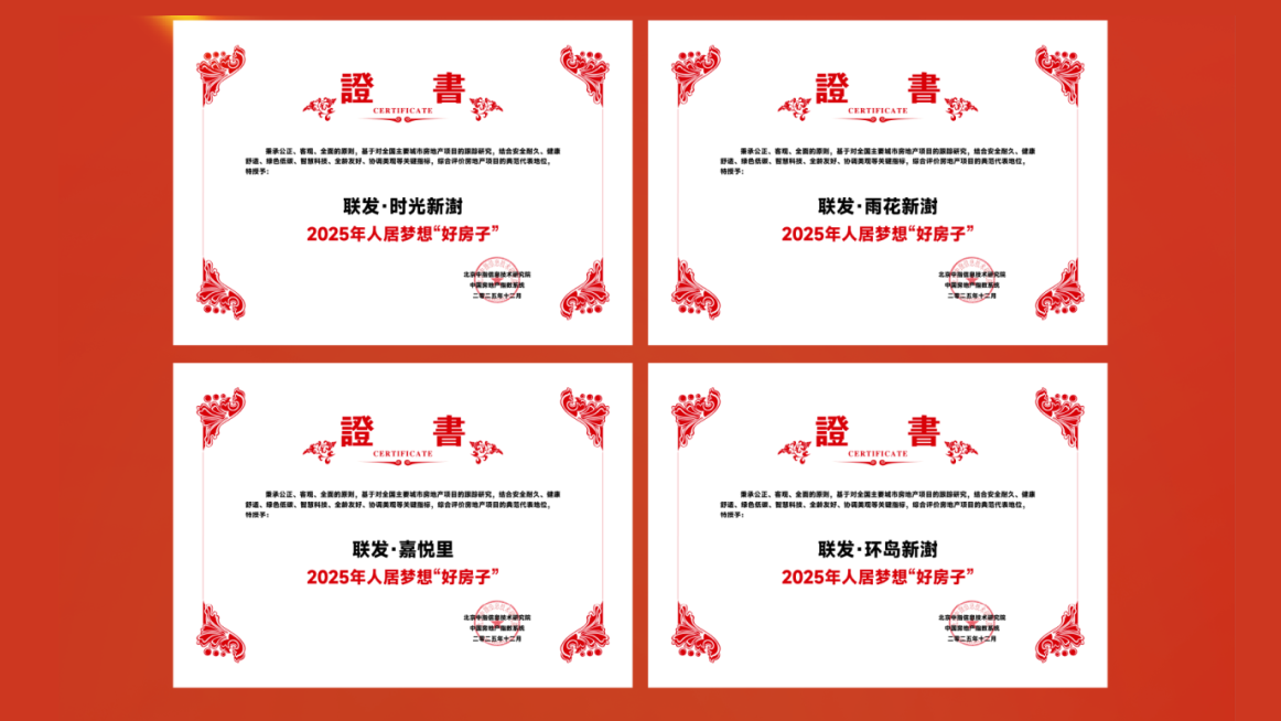 12月11日,由北京中指信息技術(shù)研究院主辦、中國房地產(chǎn)指數(shù)系統(tǒng)中國物業(yè)服務(wù)指數(shù)系統(tǒng)承辦的“2025中國房地產(chǎn)大數(shù)據(jù)年會暨2026中國房地產(chǎn)市場趨勢報告會”在北京召開。聯(lián)發(fā)集團在2025年中國房地產(chǎn)產(chǎn)品力測評中再獲行業(yè)認可:獲評“中國房地產(chǎn)產(chǎn)品力優(yōu)秀企業(yè)”稱號;集團旗下四大標桿項目“上海·時光新澍”“南京·雨花新澍”“廈門·嘉悅里”“廈門·環(huán)島新澍”,憑借產(chǎn)品設(shè)計、精工品質(zhì)與對當代居住需求的深度回應(yīng),齊齊上榜2025年人居夢想“好房子”名單。